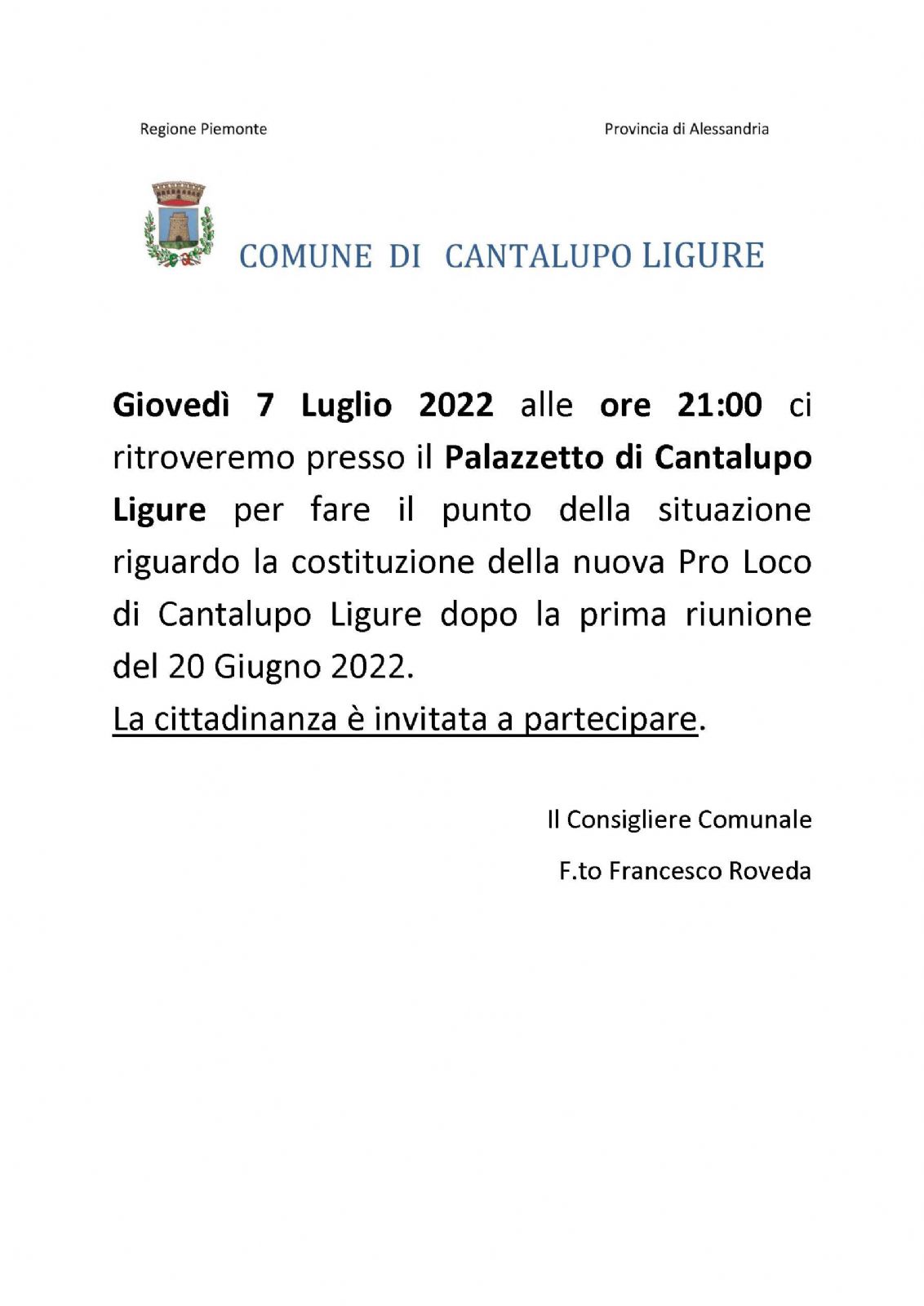 Giovedì 7 Luglio 2022 alle ore 21:00 ci ritroveremo presso il Palazzetto di Cantalupo Ligure per fare il punto della situazione riguardo la costituzione della nuova Pro Loco di Cantalupo Ligure dopo la prima riunione del 20 Giugno 2022.