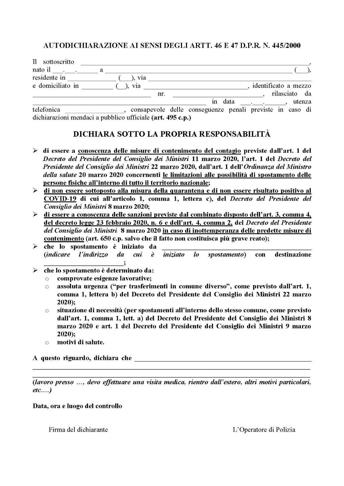 Ai fini del contenimento dell'emergenza epidemiologica da COVID-19 il Decreto del Presidente del Consiglio dei Ministri del 22 marzo 2020 ha rivisto in modo restrittivo le circostanze che legittimano gli spostamenti al di fuori della propria abitazione. Ciò ha comportato un aggiornamento del modello di autodichiarazione da compilare per motivare lo spostamento stesso.