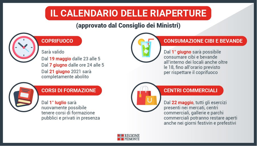 A partire da domani, 19 maggio 2021, il coprifuoco sarà valido dalle 23 alle 5 fino ad arrivare al 21 giugno con l'abolizione completa.