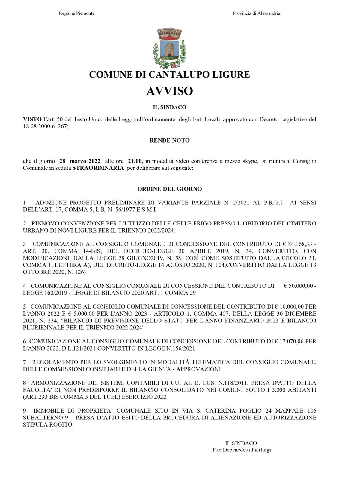 Si comunica che il 28.03.2022 ore 21, si terrà il Consiglio Comunale tramite Skype.