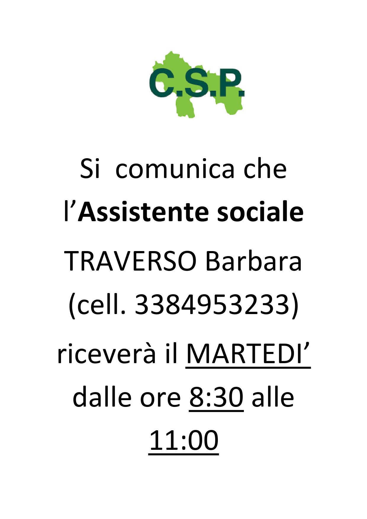 Si comunica che l’Assistente sociale TRAVERSO Barbara (cell. 338 4953233), riceverà il MARTEDI’ dalle ore 8:30 alle 11:00