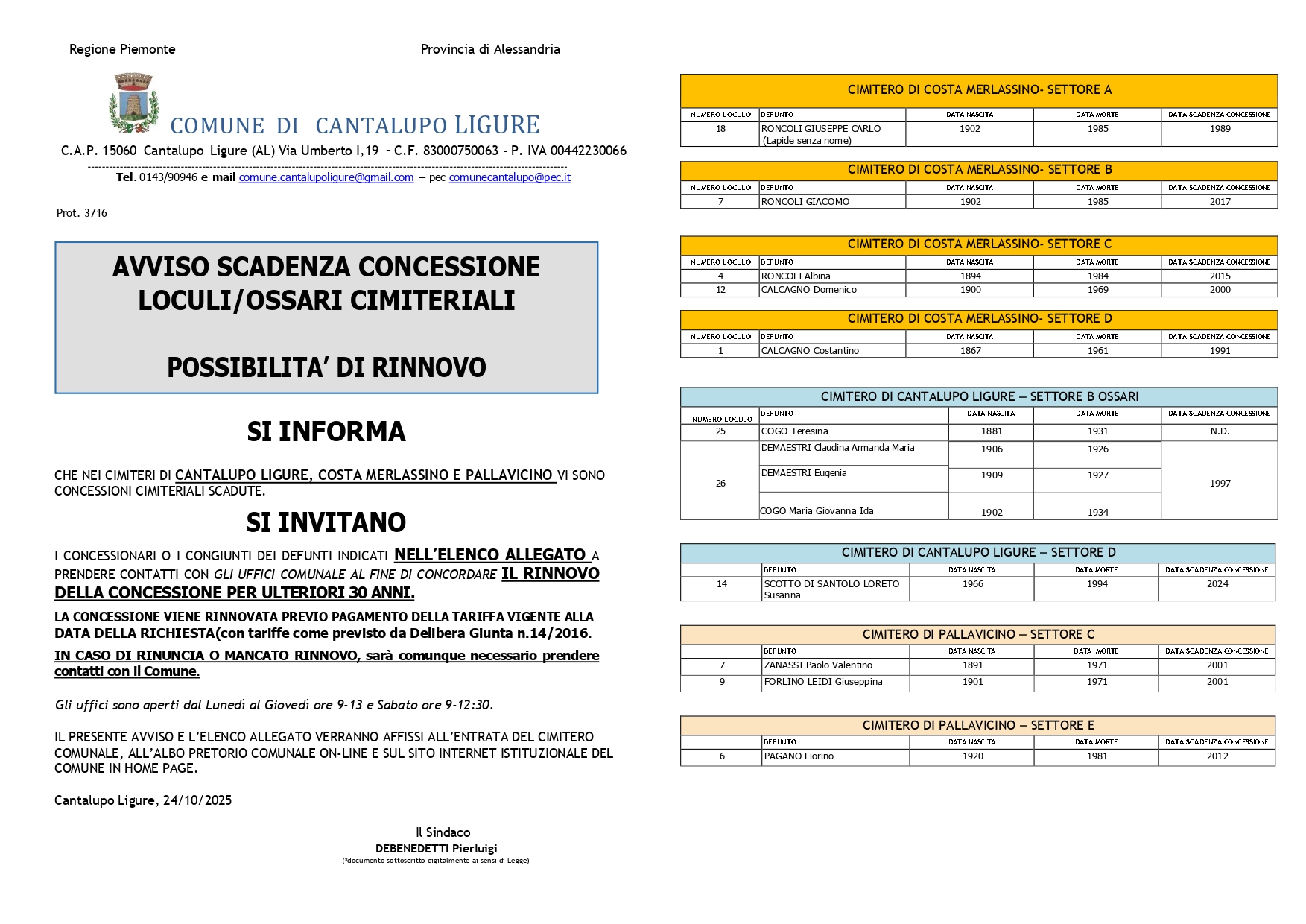 Si informa che nei cimiteri di Cantalupo Ligure, Costa Merlassino e Pallavicino vi sono concessioni cimiteriali scadute.