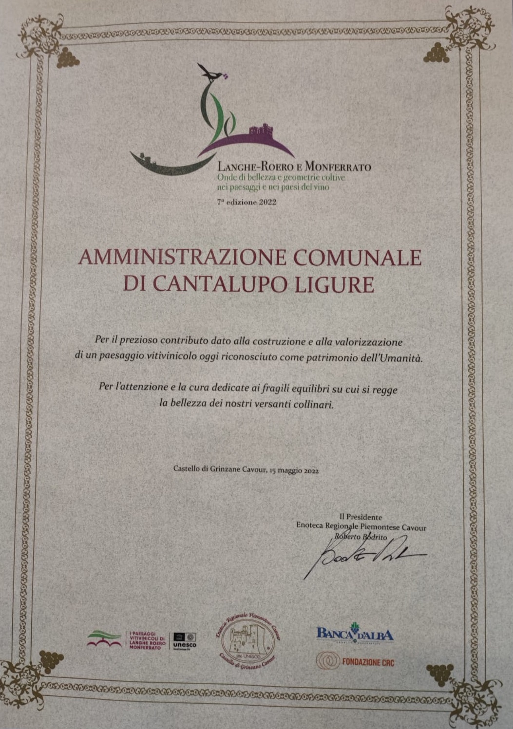 Domenica 15 maggio 2022 alle ore 10.30 nel Castello di Grinzane Cavour, sede dell’Enoteca Regionale Piemontese Cavour, si è svolta la 7ª edizione dell’Omaggio: "Langhe-Roero e Monferrato: Onde di bellezza e geometrie coltive nei paesaggi e nei paesi del vino".