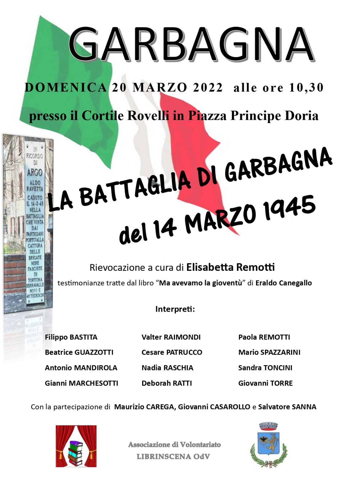 Domenica 20.03.2022 alle ore 10.30, si terrà presso il Comune di Garbagna, in Cortile Rovelli in Piazza Principe Doria la commemorazione della Battaglia di Garbagna del 14.03.1945