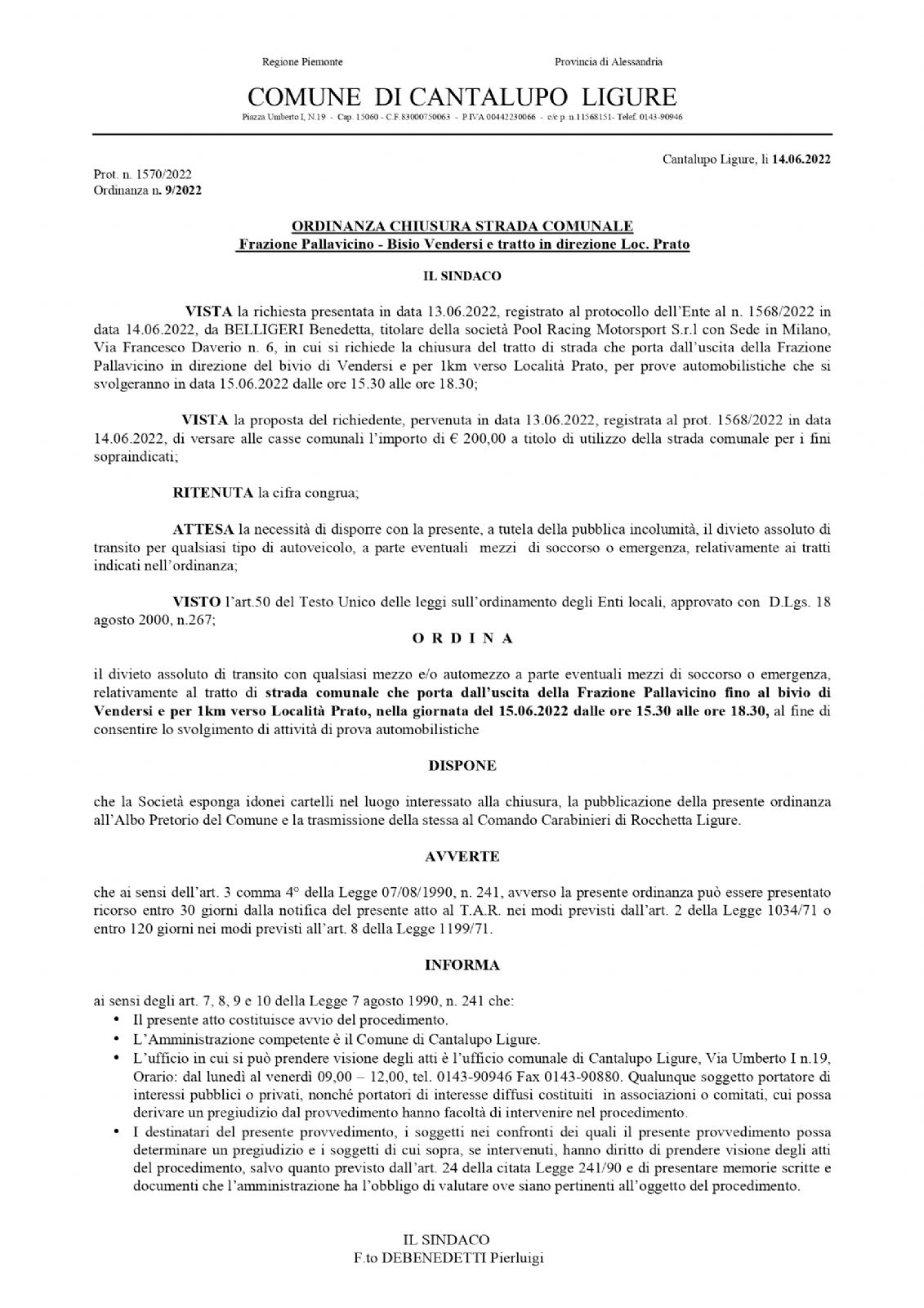 Frazione Pallavicino - Bisio Vendersi e tratto in direzione Loc. Prato, in data 15.06.2022 ore 15.30-18.30