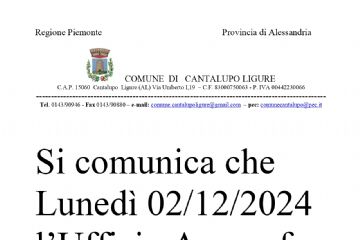 Avviso chiusura ufficio Anagrafe, Elettorare e Stato Civile 02/12/2024