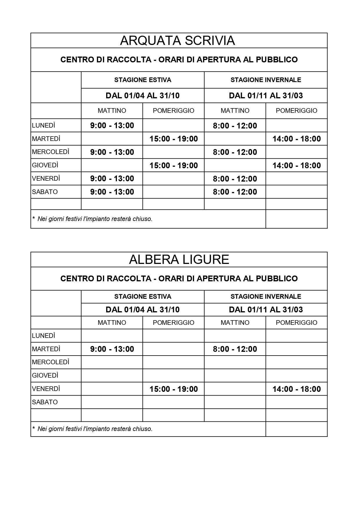 Nuovi orari centri di raccolta di Albera Ligure ed Arquata Scrivia