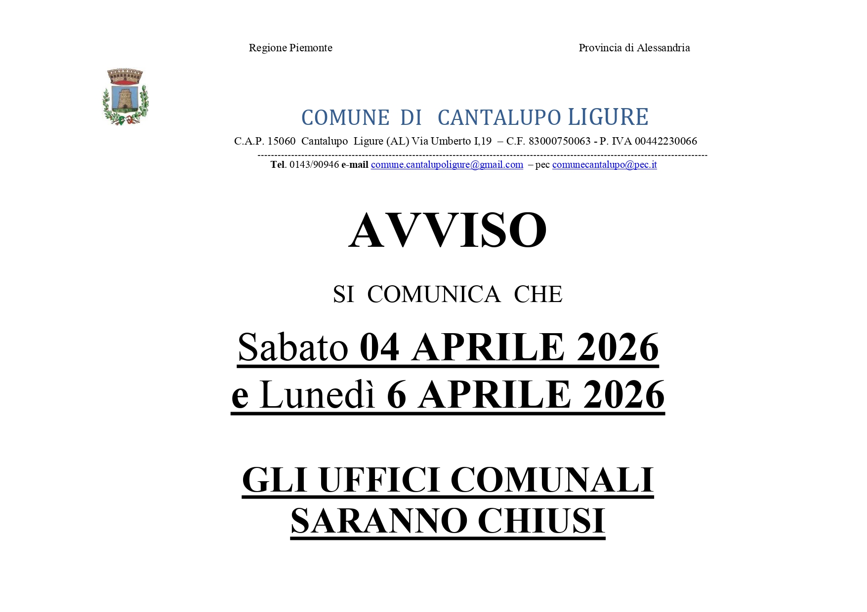 Si comunica che sabato 04 aprile 2026 e lunedì 6 aprile 2026 gli uffici comunali saranno chiusi.