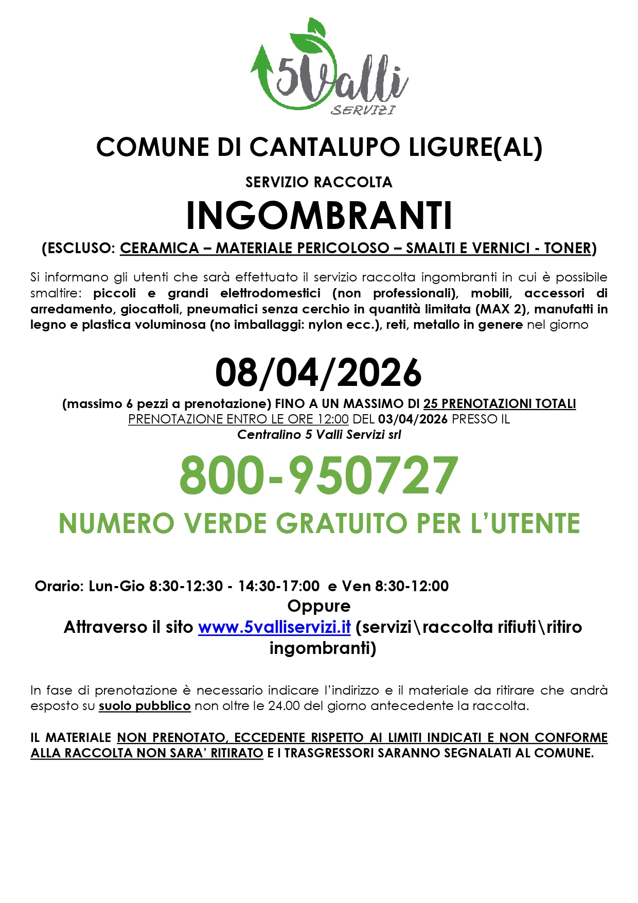 PRENOTAZIONE ENTRO LE ORE 12:00 DEL 03/04/2026 PRESSO IL Centralino 5 Valli Servizi srl