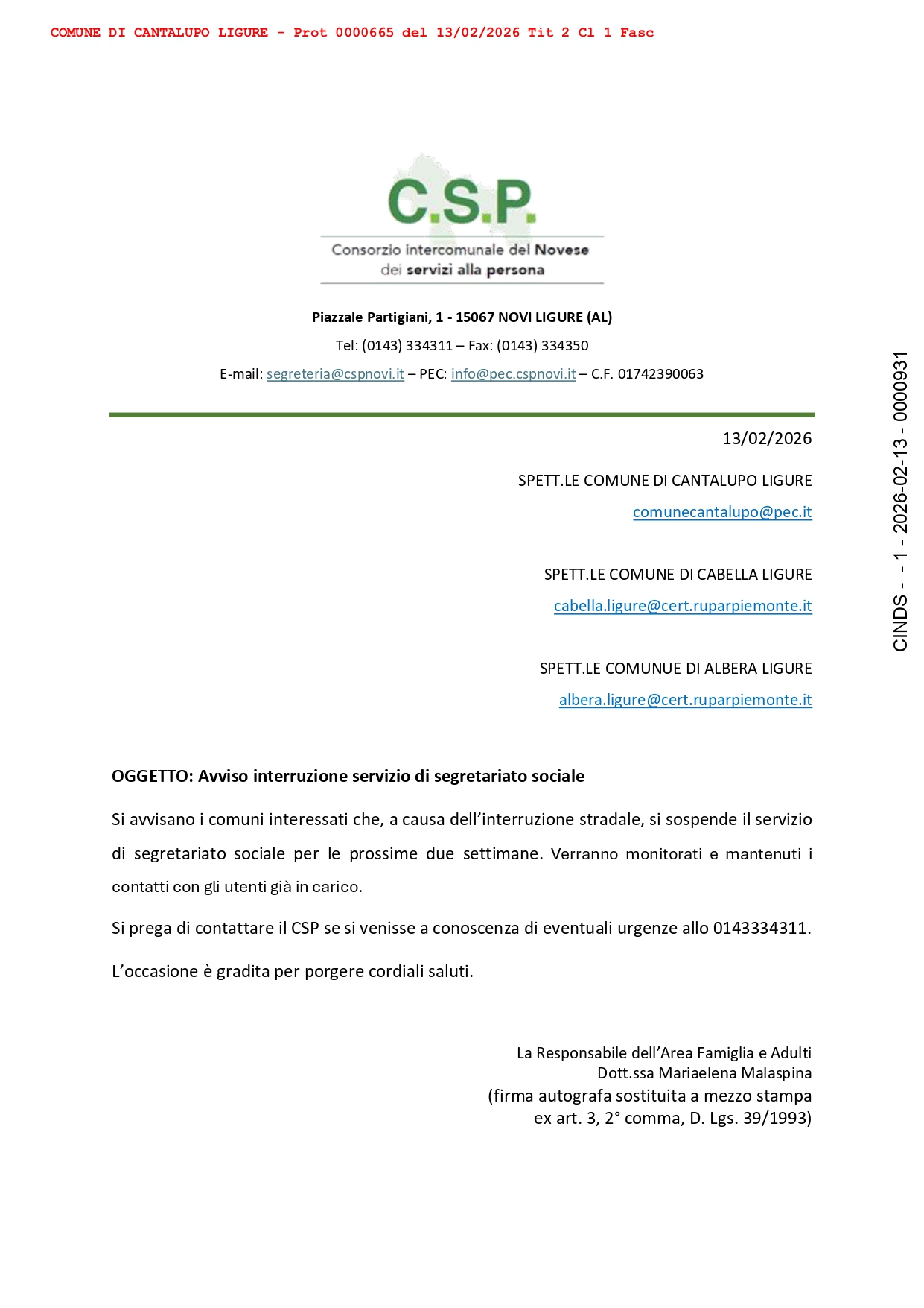 Si prega di contattare il CSP se si venisse a conoscenza di eventuali urgenze allo 0143334311.