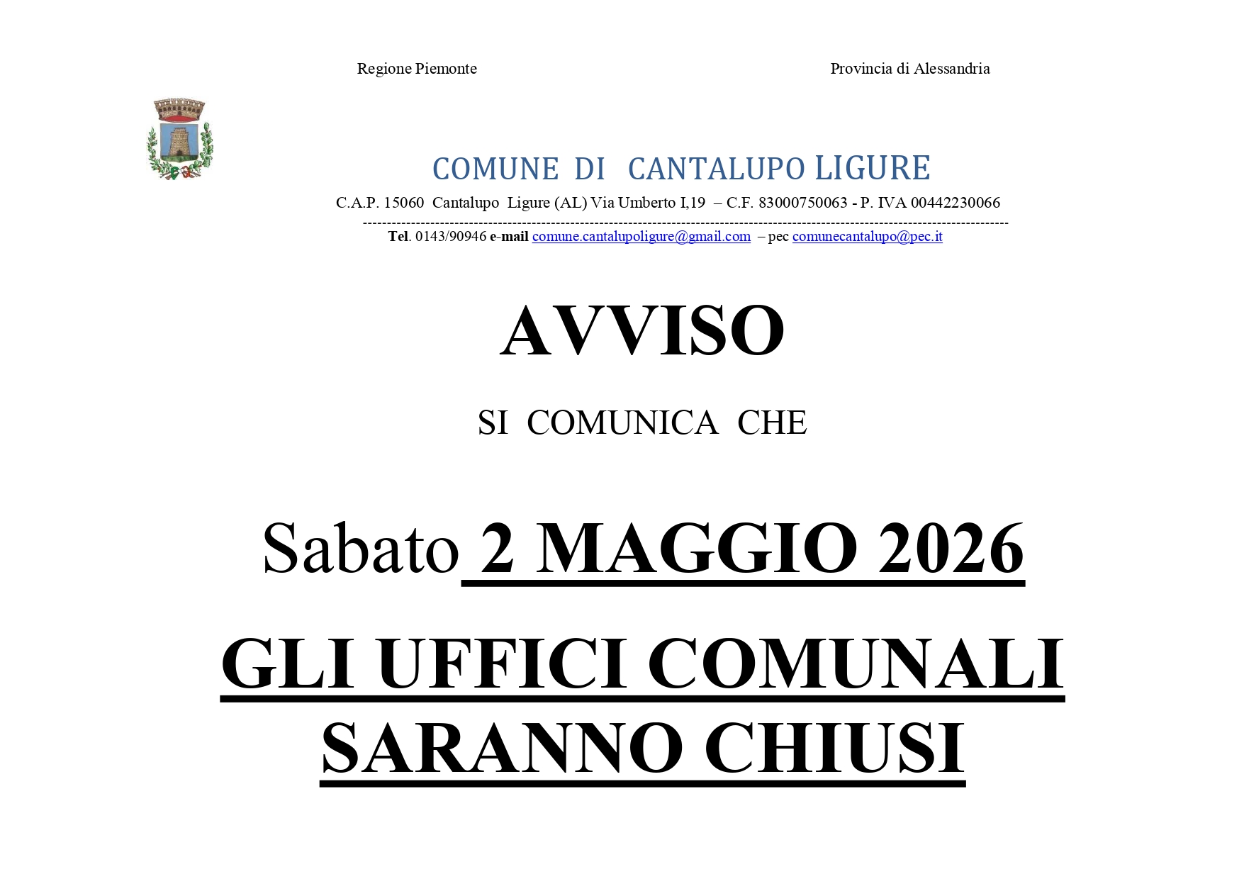 Si comunica che sabato 2 maggio 2026 gli uffici comunali saranno chiusi